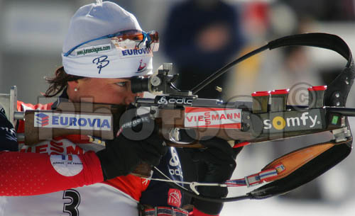 : Florence Baverel-Robert of France shooting during women pursuit race of e.on Ruhrgas IBU Biathlon World cup which was held on Pokljuka, Slovenia on 11.March 2006.