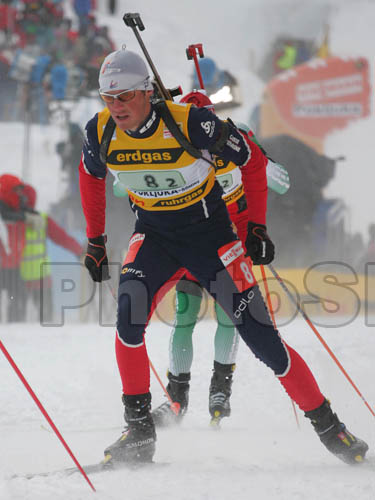 : Ferreol Cannard of France skiing during mixed relay race of IBU Biathlon World Championship which was held on Pokljuka, Slovenia on 12.March 2006. Race was won by relay of Russia, relay of Norway placed second, while relay of France finished third.