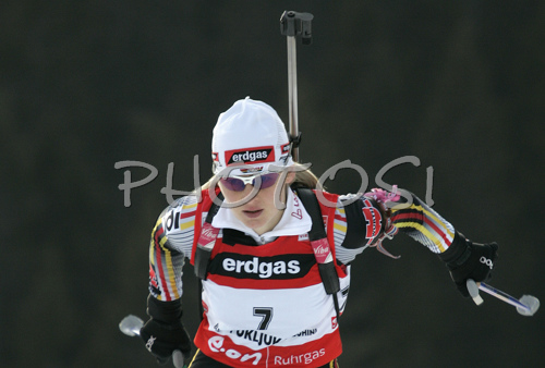 : 9th placed Katrin Apel of Germany skiing in women sprint race on Pokljuka, Slovenia. IBU Biathlon World Cup sprint race was held on Pokljuka, Slovenia on 17th of January 2007.