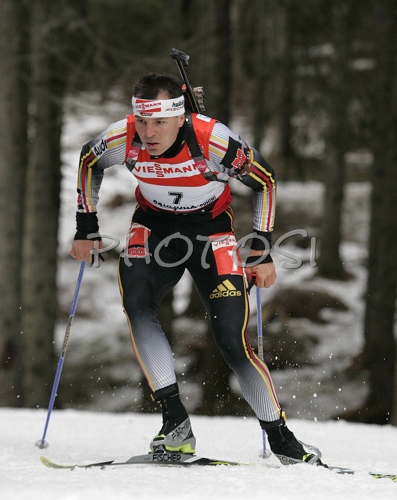 : 6th placed Sven Fischer of Germany skiing in men sprint race on Pokljuka, Slovenia. IBU Biathlon World Cup sprint race was held on Pokljuka, Slovenia on 18th of January 2007.