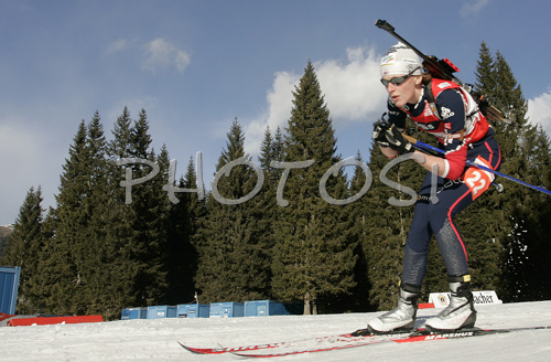 : Sandrine Bailly of France skiing in women pursuit race on Pokljuka, Slovenia. IBU Biathlon World Cup sprint race was held on Pokljuka, Slovenia on 19th of January 2007.