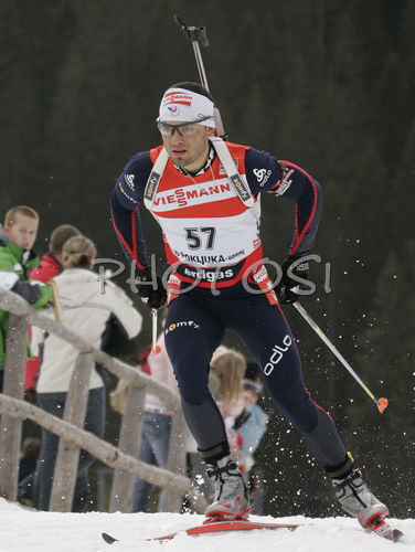 : Simon Fourcade of France skiing in men pursuit race on Pokljuka, Slovenia. IBU Biathlon World Cup sprint race was held on Pokljuka, Slovenia on 20th of January 2007.