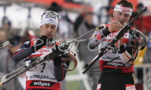 Pokljuka ,Slovenia - 20.01.2007 : Third placed Vincent Defrasne of France (L) and 7th placed Sven Fischer of Germany (R) getting ready for third shooting in men pursuit race on Pokljuka, Slovenia. IBU Biathlon World Cup sprint race was held on Pokljuka, Slovenia on 20th of January 2007. Photo by: Primoz Jeroncic/PhotoSI