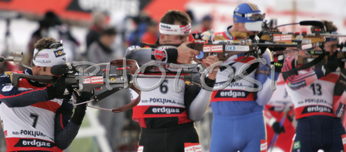 : Third placed Vincent Defrasne of France (L), 7th placed Sven Fischer of Germany (M) and 10th placed Bjorn Ferry of Sweden (R) during third shooting in men pursuit race on Pokljuka, Slovenia. IBU Biathlon World Cup sprint race was held on Pokljuka, Slovenia on 20th of January 2007.