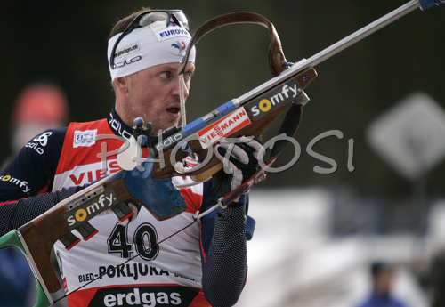 : Julien Robert of France after third shooting in men pursuit race on Pokljuka, Slovenia. IBU Biathlon World Cup sprint race was held on Pokljuka, Slovenia on 20th of January 2007.
