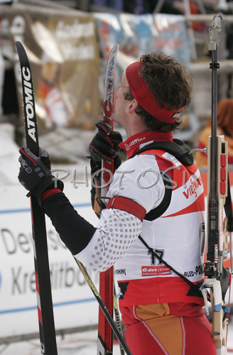 Pokljuka ,Slovenia - 20.01.2007 : Winner Christoph Sumann of Austria celebrating his victory after he crossed finish line of men pursuit race on Pokljuka, Slovenia. IBU Biathlon World Cup sprint race was held on Pokljuka, Slovenia on 20th of January 2007. Photo by: Primoz Jeroncic/PhotoSI