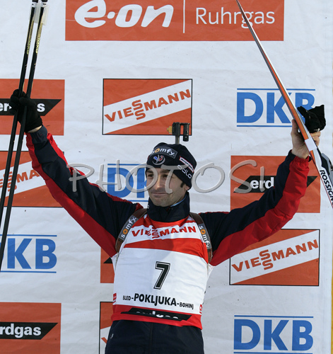 Pokljuka ,Slovenia - 20.01.2007 : Third placed Vincent Defrasne of France celebrating his medal won in men pursuit race on Pokljuka, Slovenia. IBU Biathlon World Cup sprint race was held on Pokljuka, Slovenia on 20th of January 2007. Photo by: Primoz Jeroncic/PhotoSI