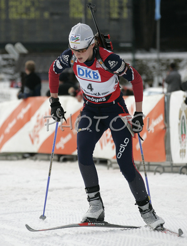 : Sandrine Bailly of France skiing in women mass start race on Pokljuka, Slovenia. IBU Biathlon World Cup sprint race was held on Pokljuka, Slovenia on 21th of January 2007.