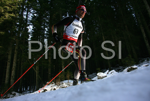 : Carsten Pump of Germany skiing in men sprint race of e.on Ruhrgas IBU Biathlon World Cup. Men sprint race of e.on Ruhrgas IBU Biathlon World Cup was held in Pokljuka, Slovenia, on 15th of December 2007.