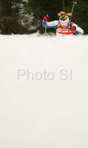 : Tadeja Brankovic-Likozar of Slovenia skiing in women sprint race of e.on Ruhrgas IBU Biathlon World Cup. Women individual race of e.on Ruhrgas IBU Biathlon World Cup was held in Pokljuka, Slovenia, on 13th of December 2007.