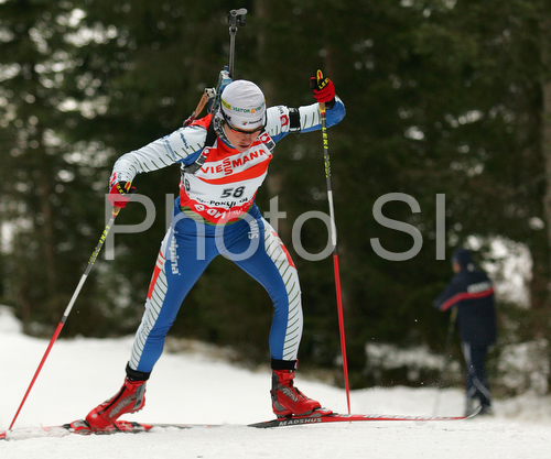 : Andreja Mali of Slovenia skiing in women sprint race of e.on Ruhrgas IBU Biathlon World Cup. Women individual race of e.on Ruhrgas IBU Biathlon World Cup was held in Pokljuka, Slovenia, on 13th of December 2007.