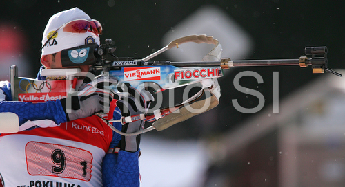 : Christian De Lorenzi of Italy skiing in men relay race of e.on Ruhrgas IBU Biathlon World Cup. Men relay race of e.on Ruhrgas IBU Biathlon World Cup was held in Pokljuka, Slovenia, on 16th of December 2007.