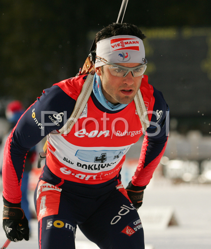 : Simon Fourcade of France skiing in men relay race of e.on Ruhrgas IBU Biathlon World Cup. Men relay race of e.on Ruhrgas IBU Biathlon World Cup was held in Pokljuka, Slovenia, on 16th of December 2007.