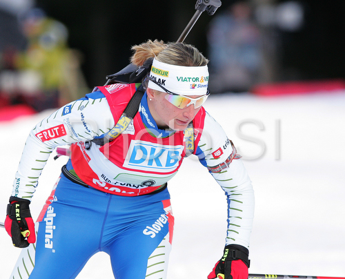 : Tadeja Brankovic-Likozar of Slovenia skiing in women relay race of e.on Ruhrgas IBU Biathlon World Cup. Women relay race of e.on Ruhrgas IBU Biathlon World Cup was held in Pokljuka, Slovenia, on 16th of December 2007.
