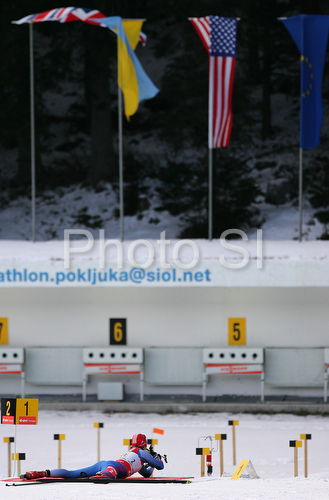 : Natalia Guseva of Russia shooting in women relay race of e.on Ruhrgas IBU Biathlon World Cup. Women relay race of e.on Ruhrgas IBU Biathlon World Cup was held in Pokljuka, Slovenia, on 16th of December 2007.