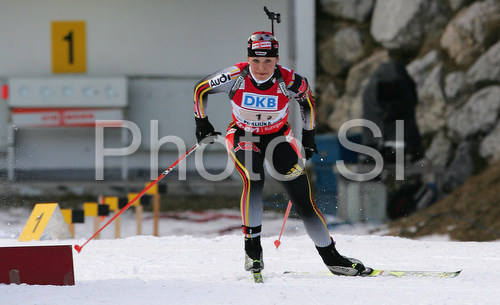: Magdalena Neuner of Germany leaving shooting place with all targets covered in women relay race of e.on Ruhrgas IBU Biathlon World Cup. Women relay race of e.on Ruhrgas IBU Biathlon World Cup was held in Pokljuka, Slovenia, on 16th of December 2007.
