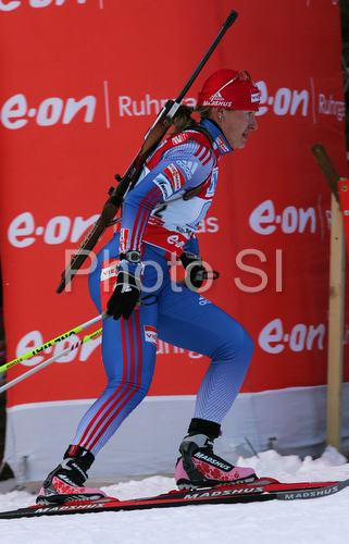 Pokljuka ,Slovenia - 16.12.2007 : Ekaterina Iourieva of Russia skiing in women relay race of e.on Ruhrgas IBU Biathlon World Cup. Women relay race of e.on Ruhrgas IBU Biathlon World Cup was held in Pokljuka, Slovenia, on 16th of December 2007. Photo by: Primoz Jeroncic/PhotoSI