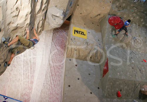 : Third placed in women competition after half finals Yuka Kobayashi of Japan (R) and Klemen Becan of Slovenia (L) are climbing in their routes during their half final climb in Climbing World Cup which was held in Kranj between 19. and 20. November 2005. Half finals were won by Angela Eiter of Austria in women competition and Flavio Crespi of Italy in men competition. Both of winners reached top of the route which gives them advantage for next days finals.