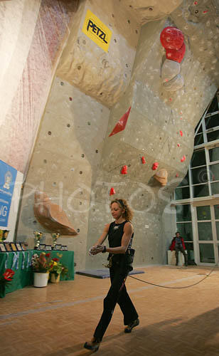 Kranj ,Slovenia - 20.11.2005 : Winner Angela Eiter of Austria is geting ready for her final climb in Climbing World Cup which was held in Kranj between 19. and 20. November 2005. Finals were won by Angela Eiter of Austria, second was Maja Vidmar of Slovenia while her teammate Natalija Gros placed third. Photo by: Primoz Jeroncic/PhotoSI