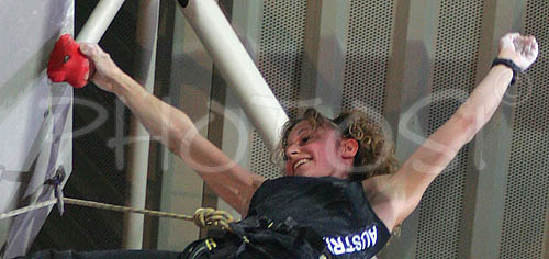 : Winner of this race and overall World Cup winner Angela Eiter of Austria celebrating her victory on top of final climb in Climbing World Cup which was held in Kranj between 19. and 20. November 2005. Finals were won by Angela Eiter of Austria, second was Maja Vidmar of Slovenia while her teammate Natalija Gros placed third. Angela Eiter was the only women who reached top of final route.