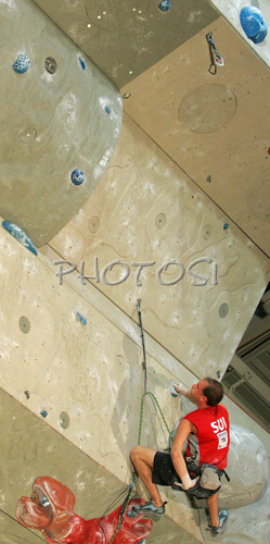 : Cedric Lachat of Switzerland climbing during men finals of last IFSC Sport Climbing World cup of 2007 season. Final race of IFSC Sport Climbing World Cup of 2007 season was held in Kranj, Slovenia on 18th of November 2007.