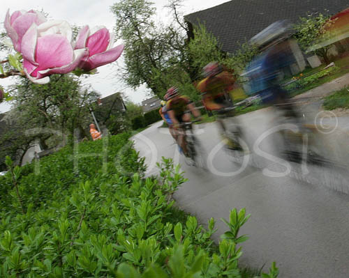 : Cyclists of elite group are cycling around streets of Sencur,Slovenia where Criterum of Sencur took place. Race with total lenght of 65km had 50 laps of 1.3km.
