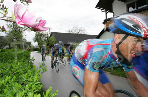 : Cyclists of elite group are cycling around streets of Sencur,Slovenia where Criterum of Sencur took place. Race with total lenght of 65km had 50 laps of 1.3km.