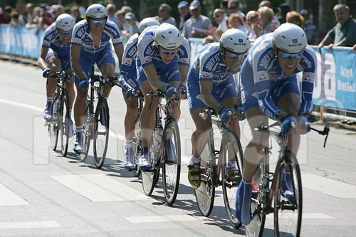 : Cyclists of Quickstep - Innergetic team competing during stage 5 of 89th Giro d Italia. Stage 5 was leading cyclists from Piacenza to Cremona, Italy. Stage 5 in lenght of 38 km was first team time trial on Giro d Italia since 1987.