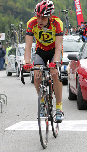 : Second placed Jure Golcer of Perutnina Ptuj crossing finish line at Vrsic, Slovenia (1611m) after placing second in third stage of 13th Tour de Slovenie 2006 (13. dirka Po Sloveniji). Third stage lead cyclists in lenght of 158km from Nova Gorica, Slovenia to top of Vrsic, Slovenia. Last uphill to Vrsic was also hardest uphill on this years Tour de Slovenia and it usually also decides winner of Tour.