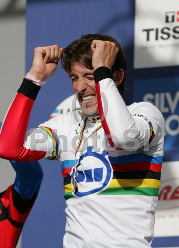 : Winner Cancellara Fabian of Switzerland celebrating his medal and World Championship title after Men Elite Time trial race of Road Cycling World Championship in Salzburg, Austria. Elite Men Time trial race was held in Salzburg, Austria on 21. September 2006.