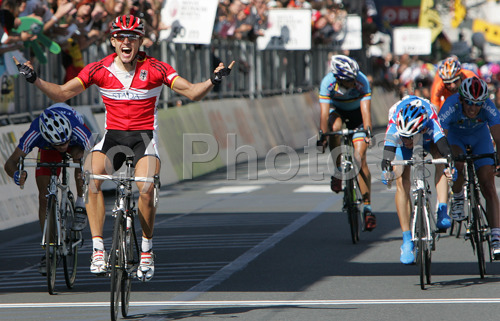 : Gerald Ciolek of Germany (M) outsprinting Romain Feillu of France (L) and Alexander Khatuntsev of Russia (R) in finish of Men Under23 road races of Road Cycling World Championship in Salzburg, Austria. Road race of Road Cycling World Championship 2006 was held in Salzburg, Austria on 23. September 2006.