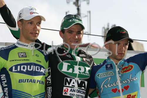 : Winner Borut Bozic of Team LPR (M), second placed Matej Mugerli of Liquigas (L) and third placed Matic Strgar of Radenska Powerbar (R) celebrating their success in 40th Grand Prix Kranj, The Filip Majcen Memorial cycle race. 40th Grand Prix of Kranj took place on 2nd of June 2007 in Kranj, Slovenia.