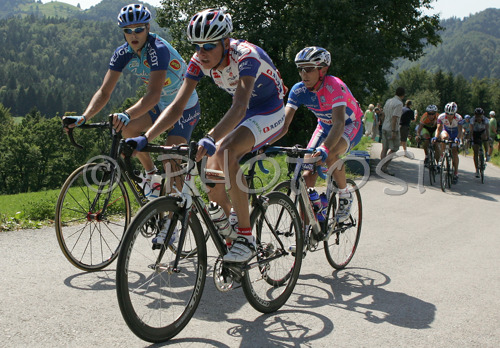 : Matej Gnezda of Radenska Powerbar (L), Tomaz Nose of Adria Mobil (M) and Tadej Valjavec of Lampre-Fondital (L) attacking during Road cycling National championships. Road cycling National championship was held in Polhov Gradec, Slovenija on 1st of July 2007.