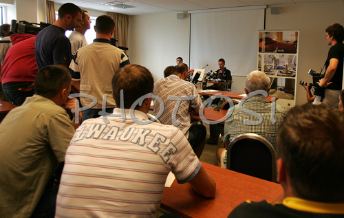 : Press hall was full of journalists and photographers when Tomaz Nose of Adria Mobil cycling team addressed journalists during press conference in Hotel Lev in Ljubljana, Slovenia, on 13th of August, 2008. Press conference addressed decision of Slovene Cycling Federation to disqualify overall winner of Tour de Slovenie 2006 and 2007, Tomaz Nose and Adria Mobil Cycling team from Tour de Slovenie 2006 due doping issues. Next to that, Antidoping commission of Slovene Cycling Federation issued ban for Nose from 26th of November 2006 to 5th of July, 2008.