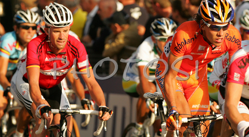 : Third placed Stefan Schumacher of Germany entering last lap of Men Elite road race of UCI Road Cycling World Championships. Men Elite road race World Championships was held on 30th of September 2007 in Stuttgart, Germany.
