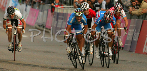 Stuttgart ,Germany - 30.09.2007 : Paolo Bettini of Italy (L) outsprints second placed Alexandr Kolobnev of Russia (M) and third placed Stefan Schumacher of Germany (R) in Men Elite road race of UCI Road Cycling World Championships. Men Elite road race World Championships was held on 30th of September 2007 in Stuttgart, Germany. Photo by: Primoz Jeroncic/PhotoSI