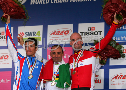 Stuttgart ,Germany - 30.09.2007 : Winner Paolo Bettini of Italy (M), second placed Alexandr Kolobnev of Russia (L) and third placed Stefan Schumacher of Germany (R) celebrating their medals won in Men Elite road race of UCI Road Cycling World Championships. Men Elite road race World Championships was held on 30th of September 2007 in Stuttgart, Germany. Photo by: Primoz Jeroncic/PhotoSI