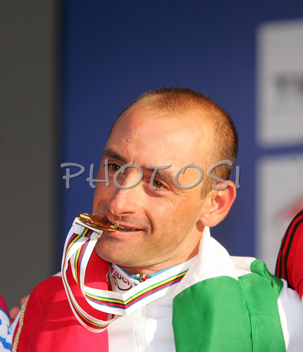 : Winner Paolo Bettini of Italy celebrating his gold medal and World Champion title won in Men Elite road race of UCI Road Cycling World Championships. Men Elite road race World Championships was held on 30th of September 2007 in Stuttgart, Germany.