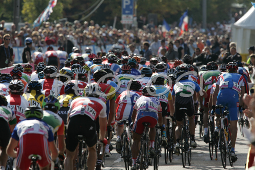 : Cyclists riding during Men Elite road races of UCI Road Cycling World Championships. Men Elite road race World Championships was held on 30th of September 2007 in Stuttgart, Germany.