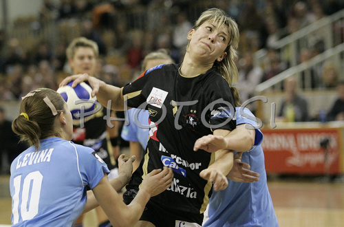: Marina Vergelyuk-Stri (no.7) of Krim Mercator (M) shooting on goal while Olga Levina (no.10) of Dinamo Volgograd (L) and Marina Stupnitskaya (no.19) of Dinamo Volgograd (R) are trying to block her during Women Handball Championships League match between Krim Mercator and Dinamo Volgograd. Krim Mercator, Ljubljana, Slovenia was hosting match of 2nd round of Women Handball Championships League against Dinamo Volgograd, Russia in Tivoli Arena on 13th of January 2007. Match was won by Krim Mercator who defeated Dinamo Volgograd 41:33.