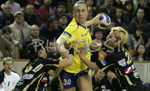 : Barbara Brauer (no.30) of Cementos la Union-Ribarroja (M) going for goal between Manuela Hrnjic (no.26) of Krim Mercator (L) and Agnes Siti Eszter (no.21) of Krim Mercator (R) during Women Handball Championships League match between Krim Mercator and Cem. la Union-Ribarroja. Krim Mercator, Ljubljana, Slovenia was hosting match of 6th round of Women Handball Championships League against Cem. la Union-Ribarroja, Alaquas, Spain, in Tivoli Arena on 24th of February 2007. Match was won by Krim Mercator with result 34:28.