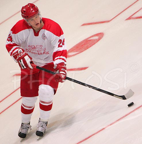 Bled ,Slovenia - 14.12.2005 : Julian Jakobsen of Denmark leading the puck during ice hockey match between Slovenia and Denmark on Ice Hockey World Championship Division I, Group A. Denmark won with 3:2, which gives them good chances for winning tournament and qualifying for Elite Division. Photo by: Primoz Jeroncic/PhotoSI