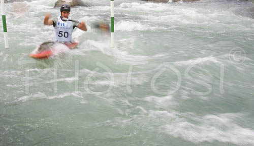 : Cirian Heurteau of Ireland paddling during first run of second International kayak and canoe slalom race Tacen 2006 in Tacen, Slovenia. Races of International kayak and canoe slalom Tacen 2006 also counted as third and fourth qualification race for Slovene whitewater kayak and canoe World cup team.