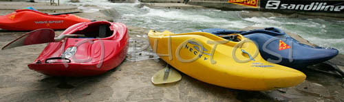 Tacen ,Slovenia - 03.06.2006 : Kayaks waiting for competitiors before start of final run during first International kayak rodeo race Slofreestyle 2006 which was held in Tacen, Slovenia on 3. June 2006. Photo by: Primoz Jeroncic/PhotoSI
