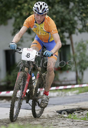 Kamnik ,Slovenia - 13.08.2006 : Miha Jaksic of Kd Calcit Kamnik Cult (Elite) competing during 6th race of Slovene cup in cross country MTB race which was held in Kamnik, Slovenia. Due to week long rain track was wet and full of mud which made racing even more demanding. Women elite, women under 23, men juniors and men masters categories had to finish 5 laps long race, while men elite and men under23 had race long 7 laps. Photo by: Primoz Jeroncic/PhotoSI