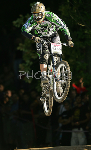 : Fabien Pedemanaud France riding in last race of Men Downhill Nissan UCI Mountain Bike World Cup. Final race of MTB World Cup was held in Maribor, Slovenia, on 16th of September 2007.