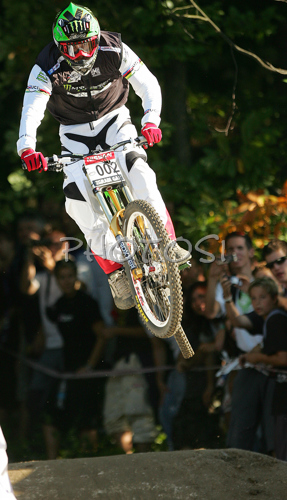: Winner Samuel Hill of Australia riding in last race of Men Downhill Nissan UCI Mountain Bike World Cup. Final race of MTB World Cup was held in Maribor, Slovenia, on 16th of September 2007.