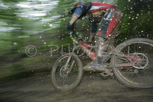 : Jan Cestnik of MTB Trbovlje Cult riding during final run of Slovene Cup race in MTB Downhill Kamnik 2006, which was held in Kamnik, Slovenia. Racing was done in extreme conditions caused by heavy rainfall on race day which turned downhill track into mud bath for riders and spectators.