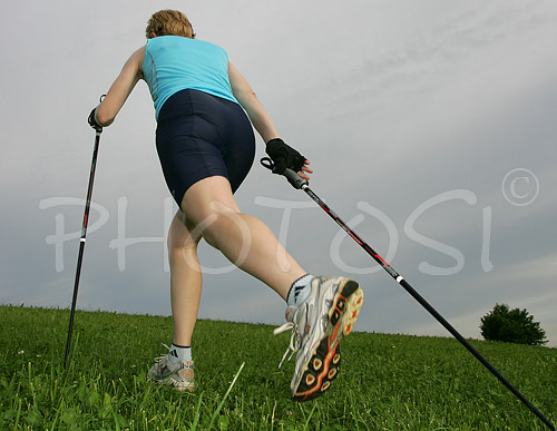 : Nordic walker is enjoying her sport on fields near village Preddvor, Slovenia, on nice late spring afternoon. Nordic walking was first used as a summer training method by cross-country skiers. Nordic walking is one of the fastest growing recreational fitness sports in the world. Nordic walking is fitness walking with specially designed nordic walker poles and offers a very efficient, aerobic and easy way to improve your physical condition irrespective of age, sex or physical condition.