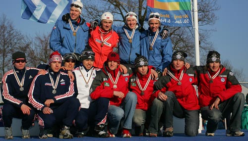 : Winning relay team of Norway (M) with members Glenn Elvestad, Eirik Kurland Olsen, Eirik Saeves and Petter Northug, second placed team of Russia (L) with members Nikolay Morilov, Yuriy Vinogradov, Andrey Parfenov and Illia Chernousov and third placed relay team of Czech (R) with members Ales Razym, Jan Krska, Ondrej Horyna and Martin Jaks are celebrating their medals won in 4x5km Junior Men relay race of FIS Nordic Junior Ski World Championships which was held in Medvode, Slovenia on 5.February 2006.